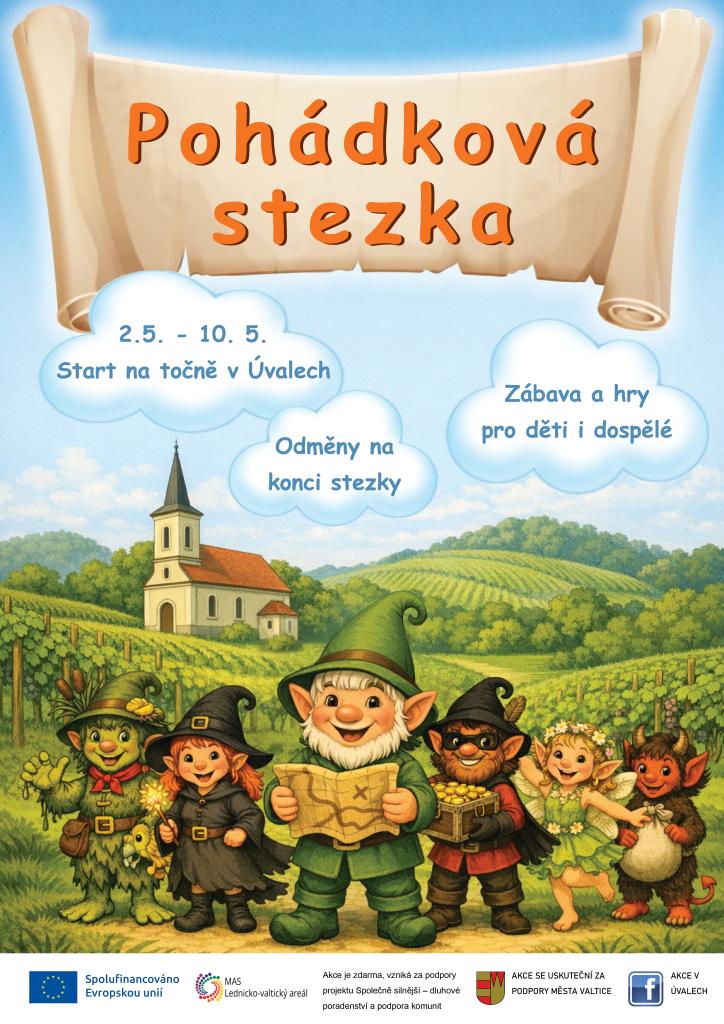 V sobotu 2. - 10. května 2026 se v Úvalech uskuteční Pohádková stezka, která nabídne zábavu a hry pro všechny. Start akce bude na točně a účastníci se mohou těšit na odměny jak pro děti, tak pro dospělé. Tato akce je organizována s podporou města Valtice a spolufinancována Evropskou unií. Vstup je zdarma, a tak si ji může užít celá rodina.